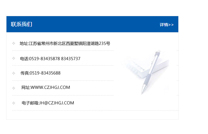 地址:常州市新北區友邦商務大廈1幢16、17層  電話:0519-85101652  傳真:0519-85112595  郵編:213022  網址:www.cz-jiayue_cn.cnwangke.com  郵箱:xiajifengaa@163.com
